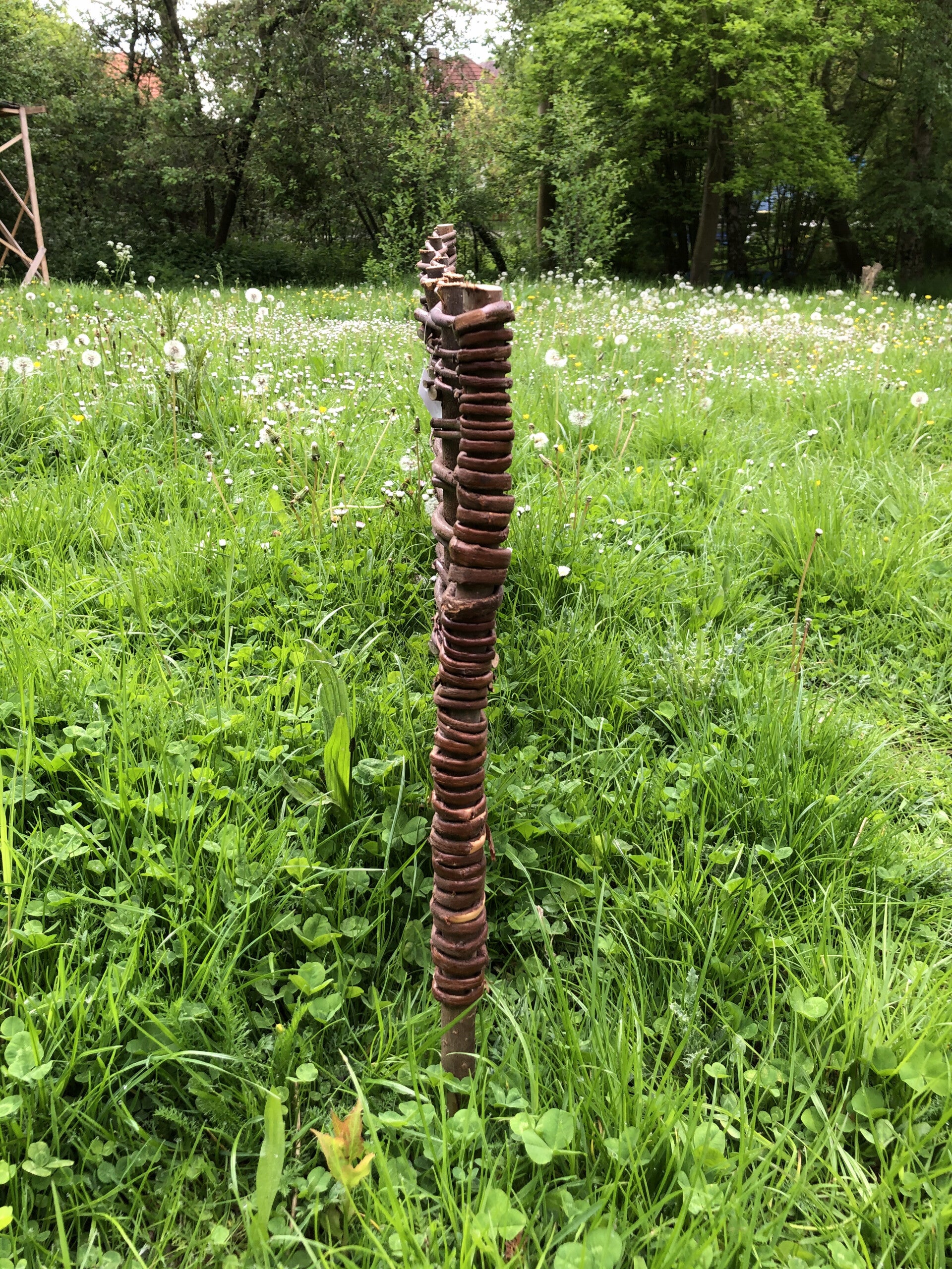 Schöne Beeteinfassung aus ungeschälter Weide, einfach geflochten um Haselnussäste. Höher als gewöhnliche Einfassungen.