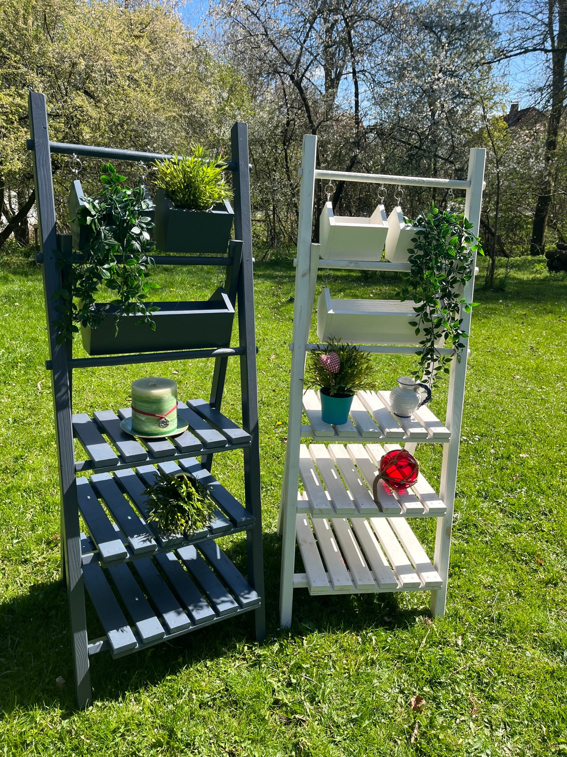 Dekorative Gartenleiter aus Kiefernholz in weiß oder anthrazit. Mit drei Regaleinlegeböden für Deko, Pflanzen Blumentöpfe etc.. Drei Blumenkästen oben eingehängt. Leicht aufklappbar.