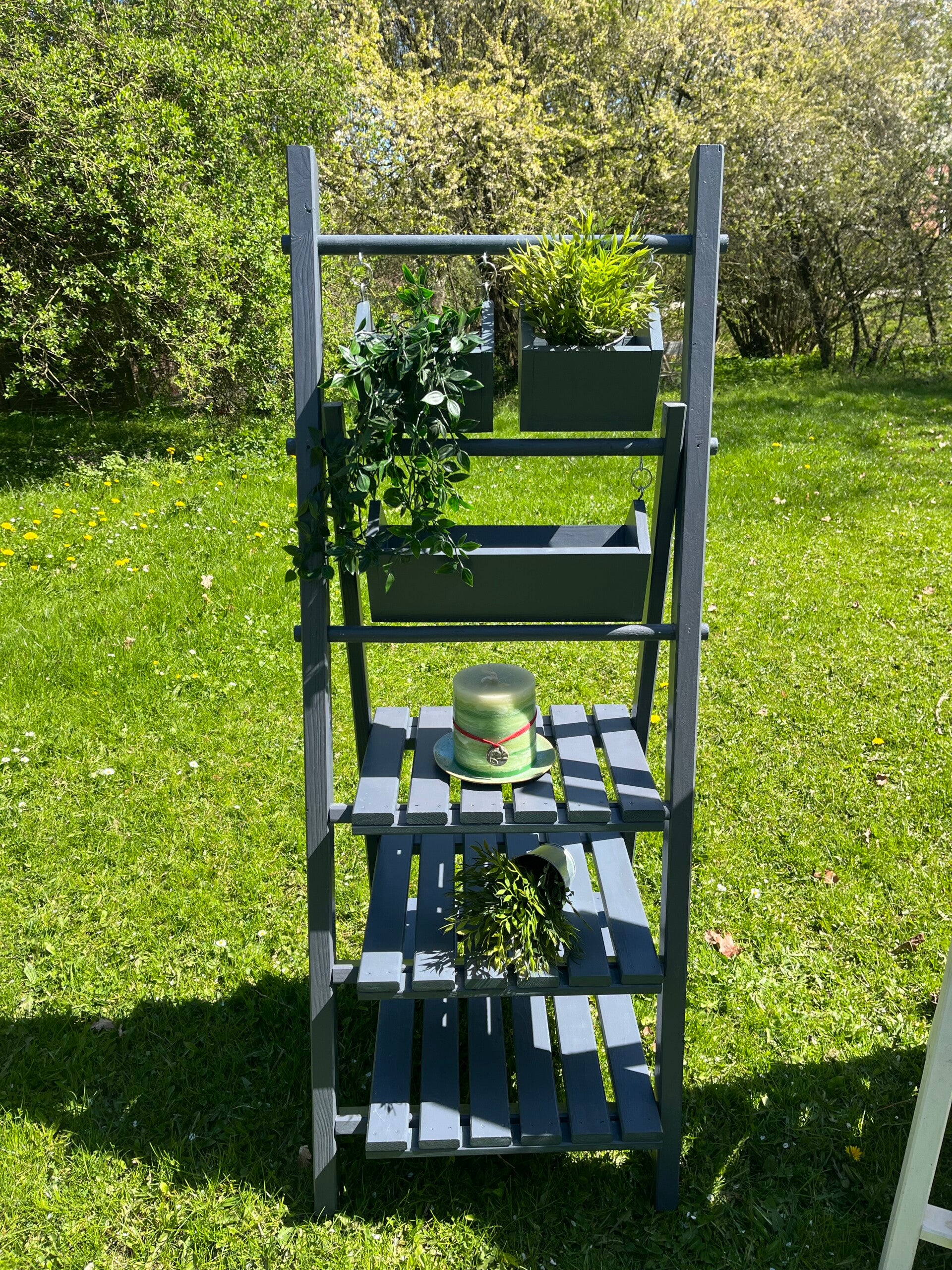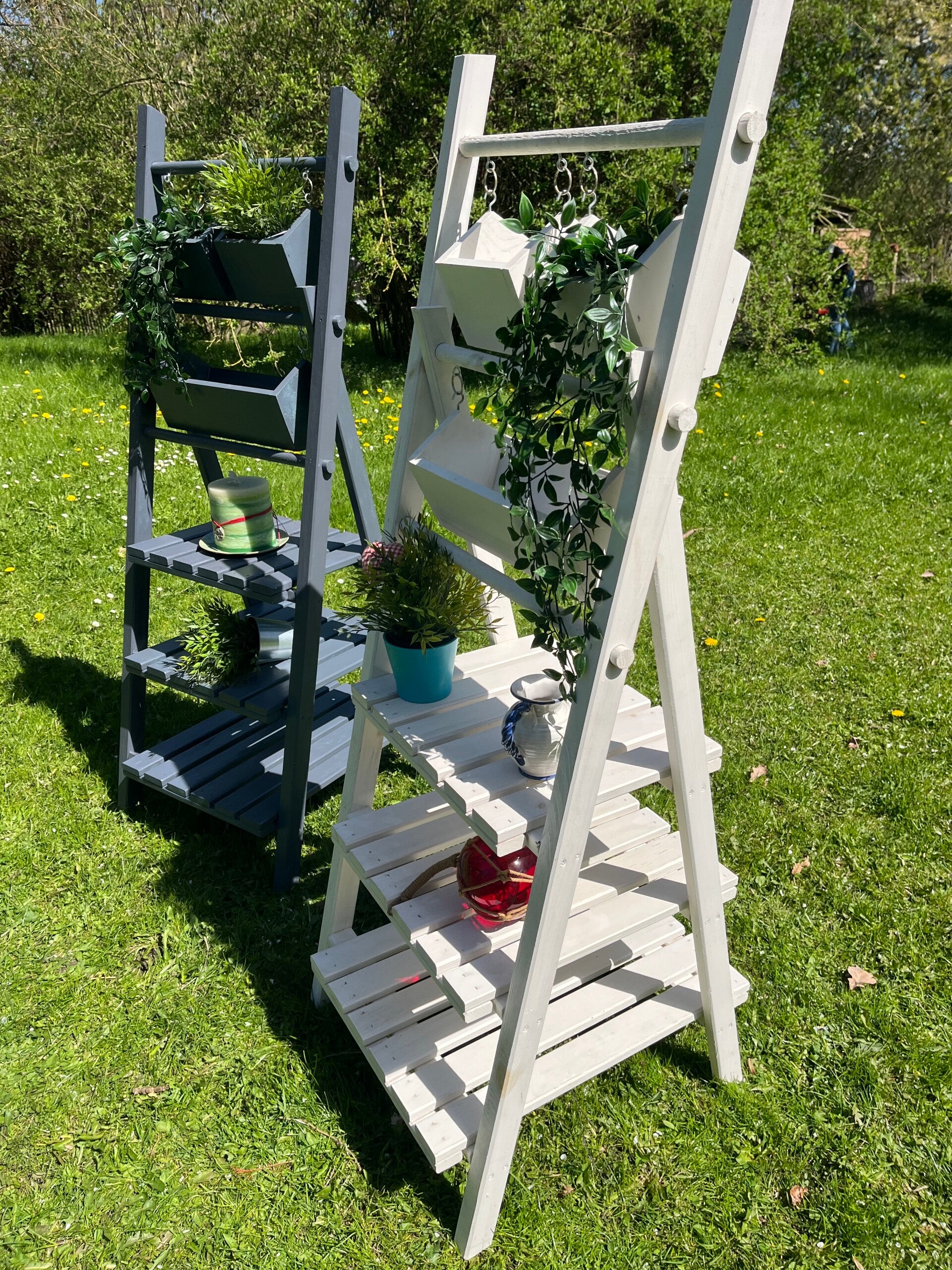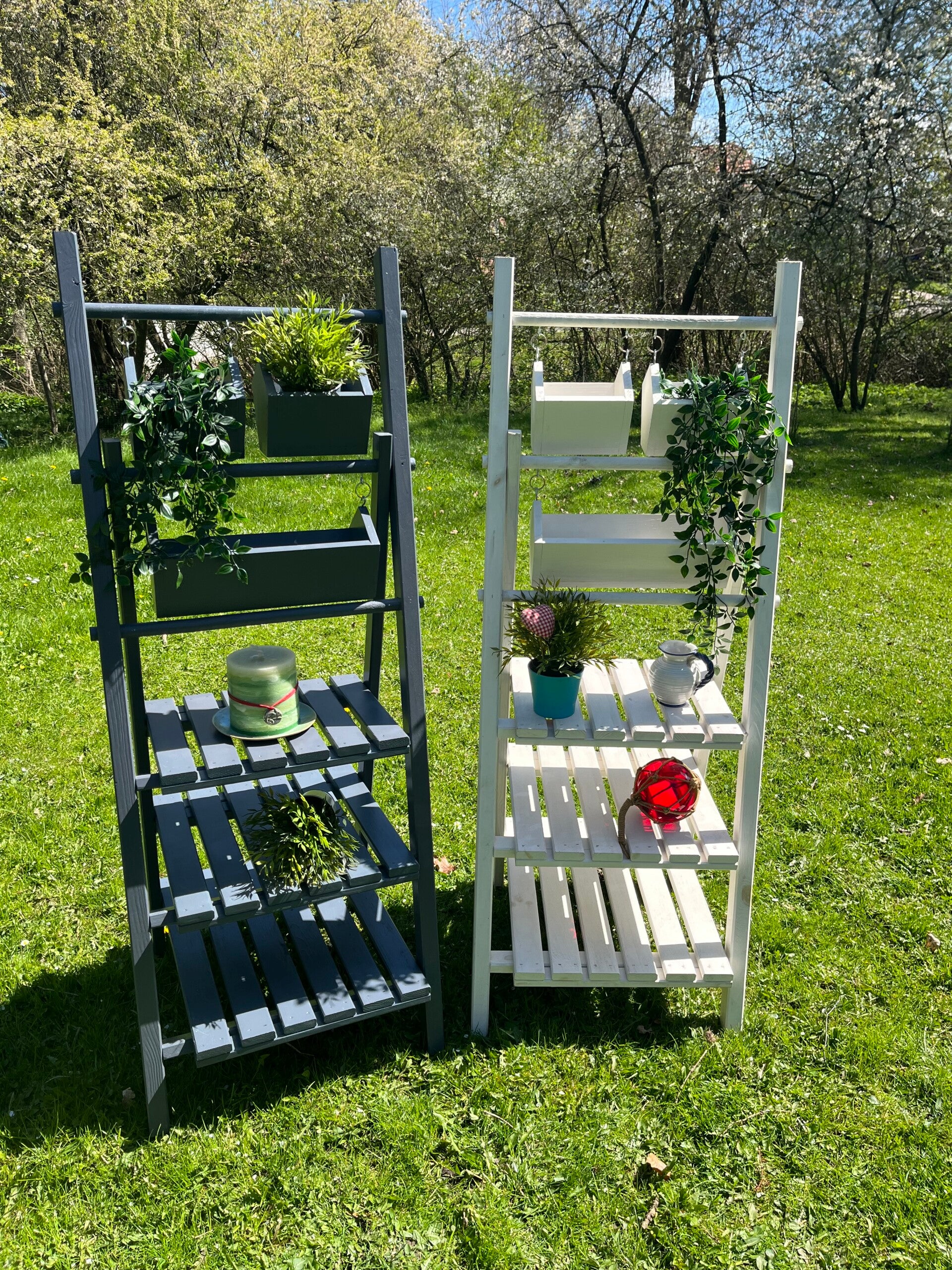 Dekorative Gartenleiter aus Kiefernholz in weiß oder anthrazit. Mit drei Regaleinlegeböden für Deko, Pflanzen Blumentöpfe etc.. Drei Blumenkästen oben eingehängt. Leicht aufklappbar.